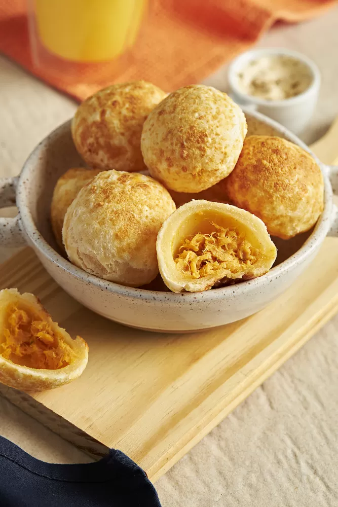 pão de queijo recheado de frango, cru congelado.